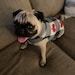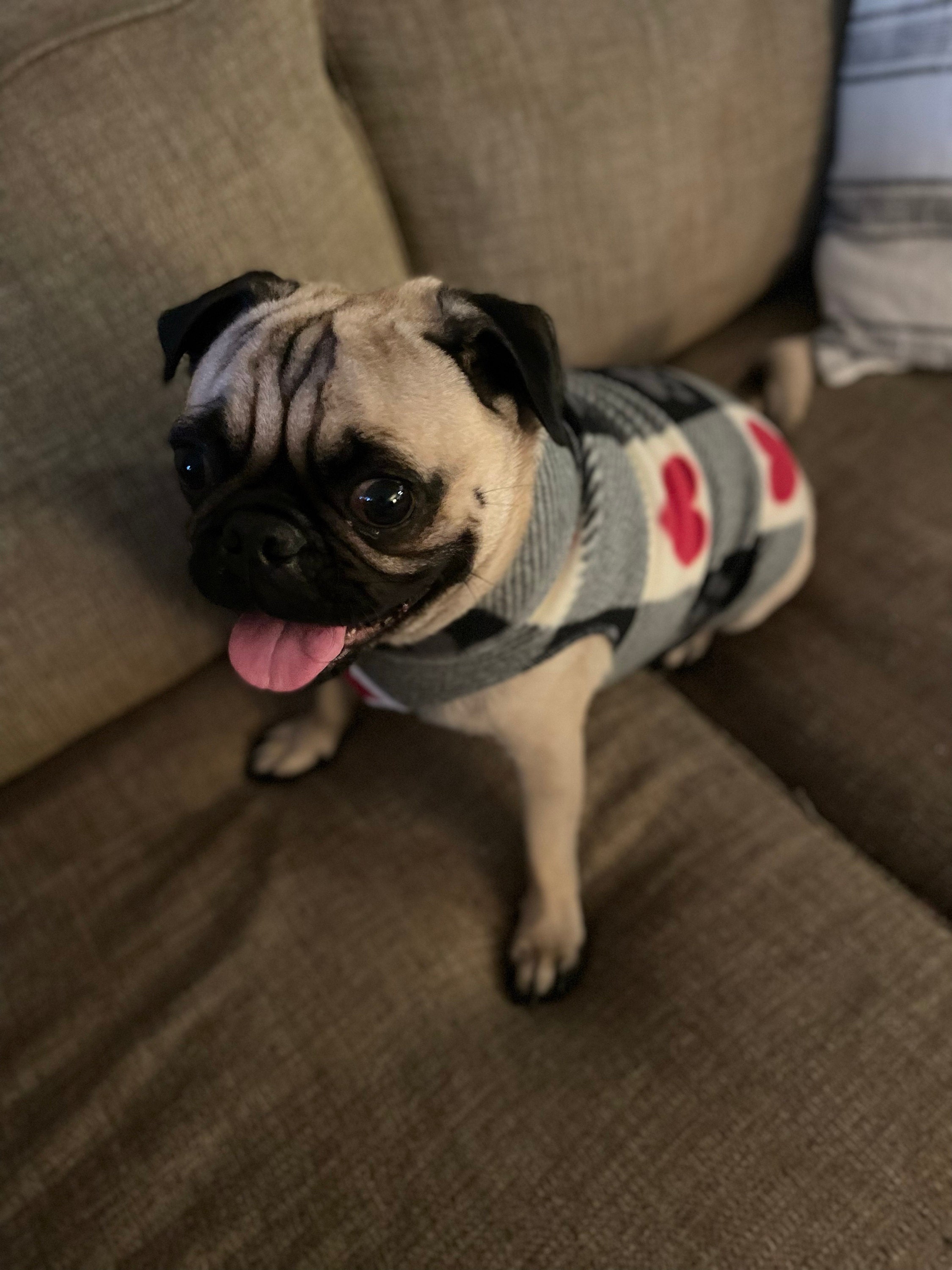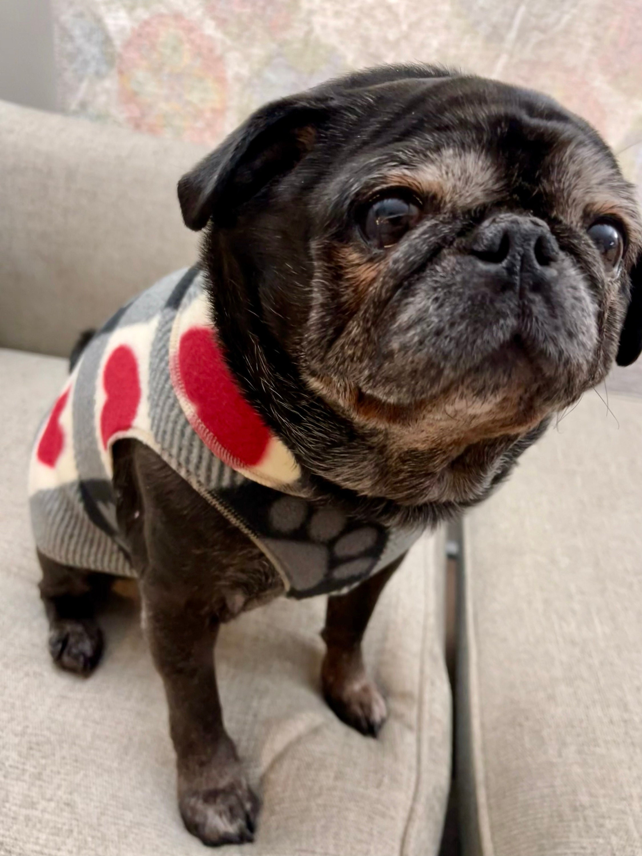 Pugdashian's 'LOVE YOU' fleece pullover not only keeps your pug cozy, but it's also a fun-to-wear fashion piece. The print is black & white checks with red hearts & paw prints on soft fleece. The fabric has stretch, allowing the 'one size' to fit most pugs. The one-piece fleece is worn by pulling it over the head and placing the front legs in the two-leg holes.